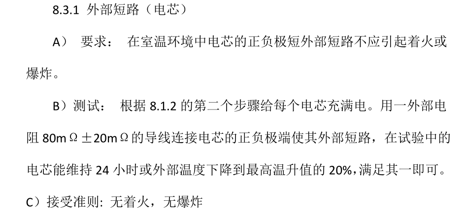 將電池按(àn)照規定(dìng)的試驗方法充滿電後,放置在55℃±5℃的環境中,待(dài)電池(chí)溫度達到(dào)55℃±5℃後,再放置30min。然後(hòu)用導線連接電池(chí)正負極端,並確保全部外部電阻為80mΩ±20mΩ。試驗過程中監測電池溫度變化,當(dāng)出現以下兩種情形之一時,試驗終止。
